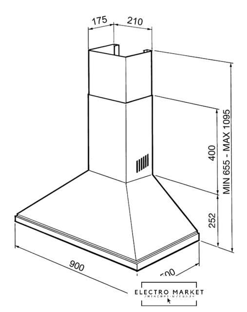 конструкция Т-образная, монтаж настенный, ширина 90 см, управление электронное/кнопочное, производительность вытяжки 480 м³/ч, цвет черный