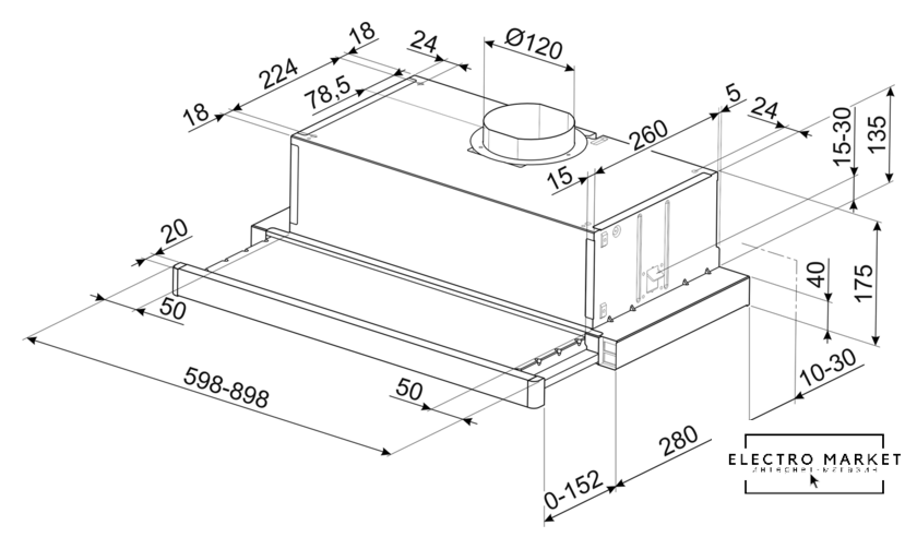 конструкция телескопическая, монтаж для встраивания, управление электронное/кнопочное, производительность мотора 800 м³/ч, ширина 89.8 см
