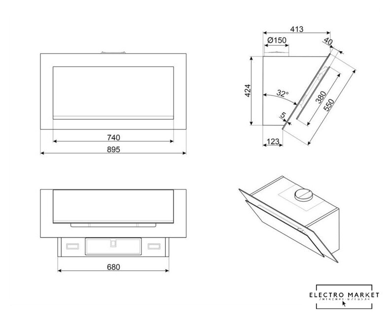 конструкция коробчатая, монтаж настенный, ширина 32 см, управление электронное/кнопочное, производительность мотора 1200 м³/ч, цвет черный