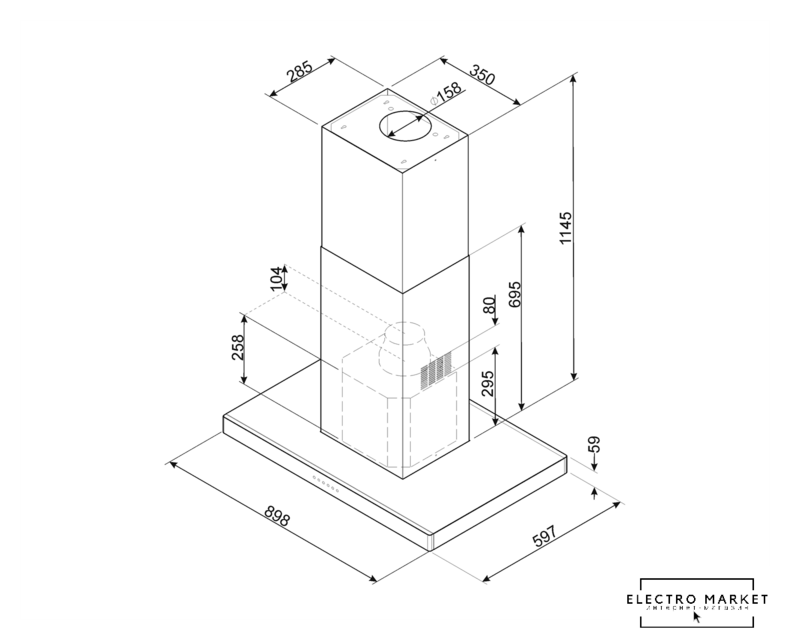 конструкция купольная, монтаж настенный/островной, управление электронное/кнопочное, производительность мотора 800 м³/ч, ширина 51.5 см