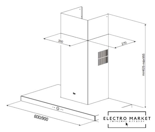 конструкция Т-образная, монтаж настенный, управление электронное/кнопочное, производительность мотора 1200 м³/ч, ширина 90 см