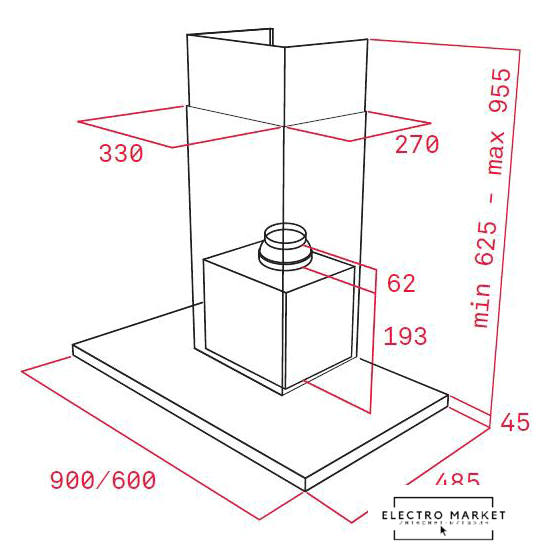 конструкция скрытая, монтаж для встраивания, ширина 90 см, управление электронное, производительность вытяжки 400 м³/ч, производительность мотора 850 м³/ч, цвет нержавеющая сталь