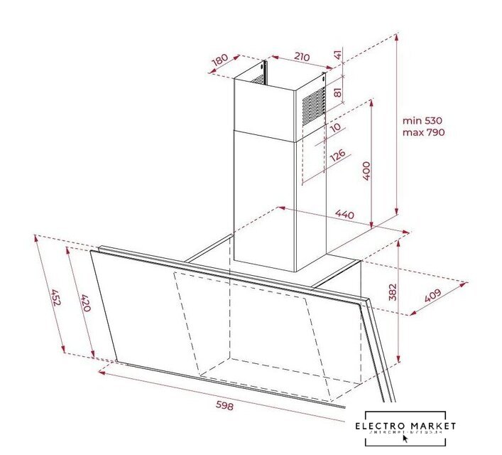 конструкция наклонная, монтаж настенный, ширина 79.5 см, управление сенсорное, производительность вытяжки 420 м³/ч, цвет черный