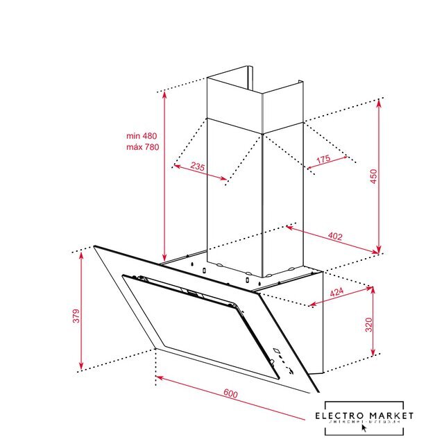 конструкция наклонная, монтаж настенный, ширина 60 см, управление сенсорное, производительность вытяжки 410 м³/ч, цвет нержавеющая сталь/черный