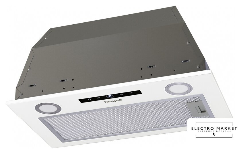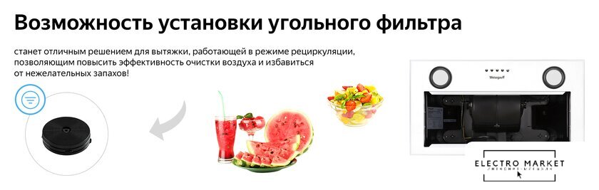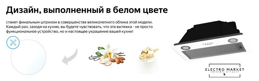 конструкция наклонная, монтаж настенный, ширина 49.6 см, управление механическое/кнопочное, производительность мотора 1100 м³/ч, цвет белый