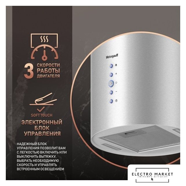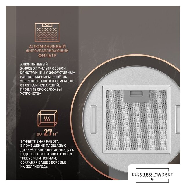 конструкция купольная, монтаж настенный, управление механическое/слайдерное, производительность мотора 700 м³/ч, ширина 59.8 см