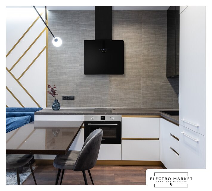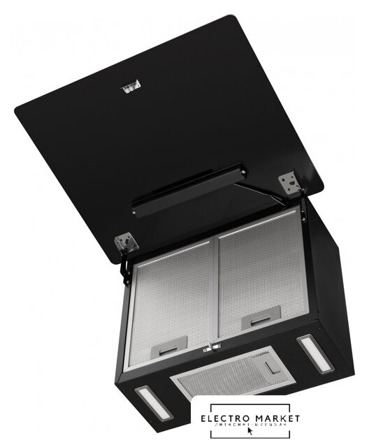 конструкция скрытая, монтаж для встраивания, ширина 59.6 см, управление сенсорное/жестами, производительность мотора 1200 м³/ч, цвет черный