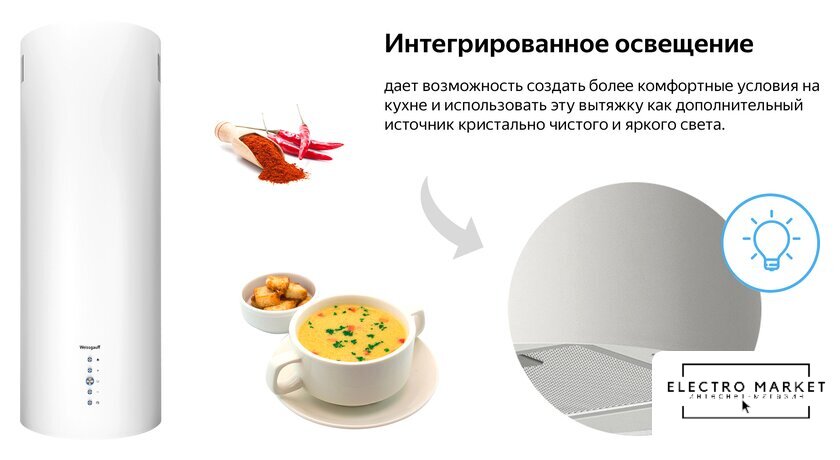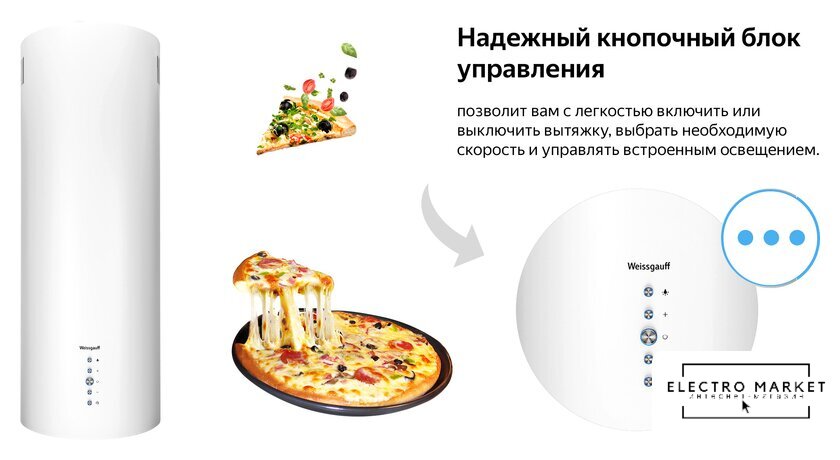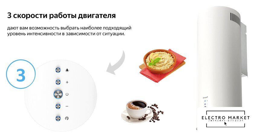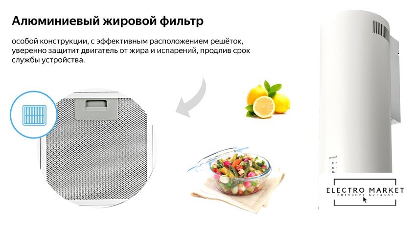 конструкция купольная, монтаж настенный, ширина 59 см, управление механическое/кнопочное, производительность мотора 650 м³/ч, цвет слоновая кость