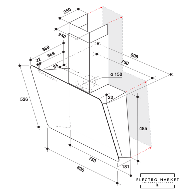конструкция Т-образная, монтаж настенный, ширина 59.8 см, управление сенсорное, производительность вытяжки 405 м³/ч, производительность мотора 1200 м³/ч, цвет нержавеющая сталь