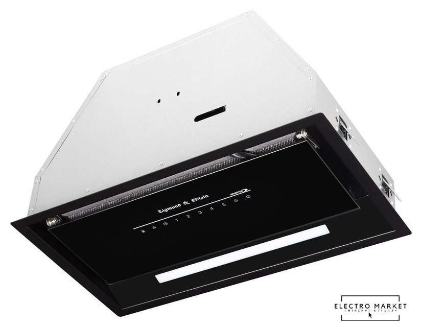 конструкция скрытая, монтаж для встраивания, ширина 59.8 см, управление поворотный переключатель, производительность мотора 850 м³/ч, цвет черный