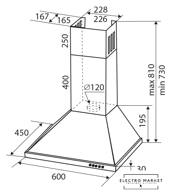 конструкция наклонная, монтаж настенный, ширина 59.7 см, управление механическое/кнопочное, производительность мотора 890 м³/ч, цвет белый