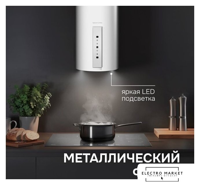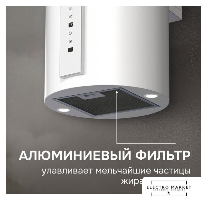 конструкция наклонная, монтаж настенный, ширина 49 см, управление электронное/кнопочное, производительность мотора 700 м³/ч, цвет белый