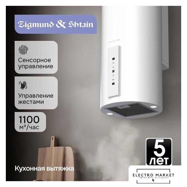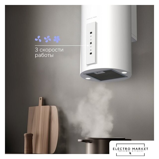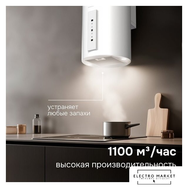 конструкция наклонная, монтаж настенный, ширина 60 см, управление сенсорное, производительность мотора 1000 м³/ч, цвет белый