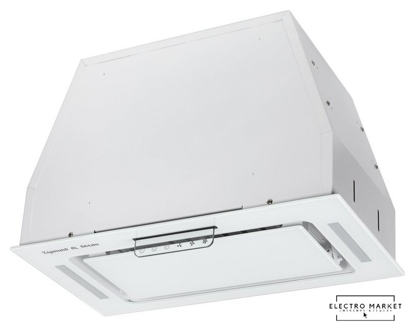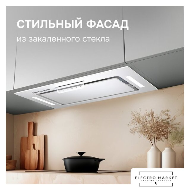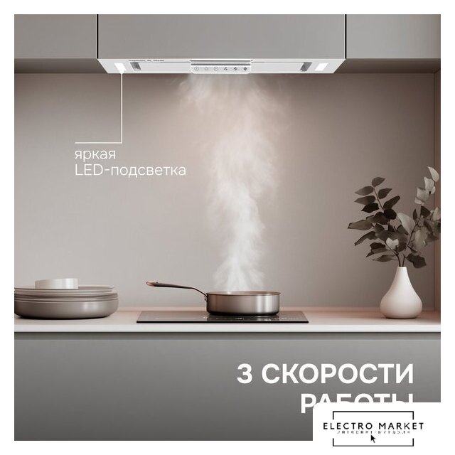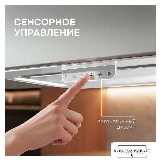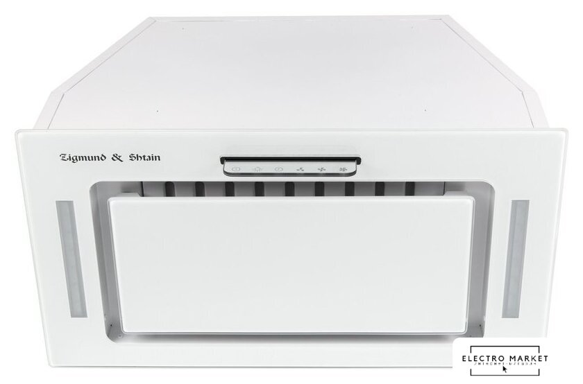 конструкция телескопическая, монтаж для встраивания, ширина 59.5 см, управление сенсорное, производительность мотора 410 м³/ч, цвет белый/серебристый