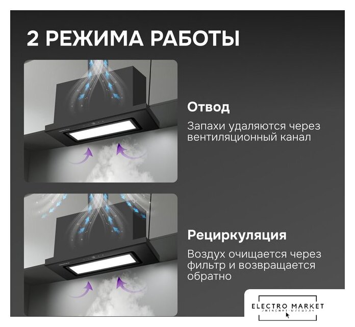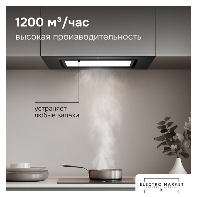 конструкция наклонная, монтаж настенный, ширина 60 см, управление сенсорное, производительность мотора 1260 м³/ч, цвет черный