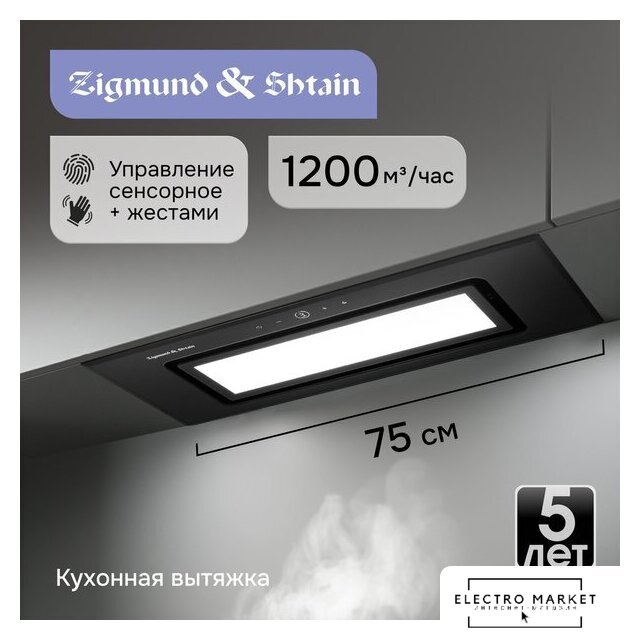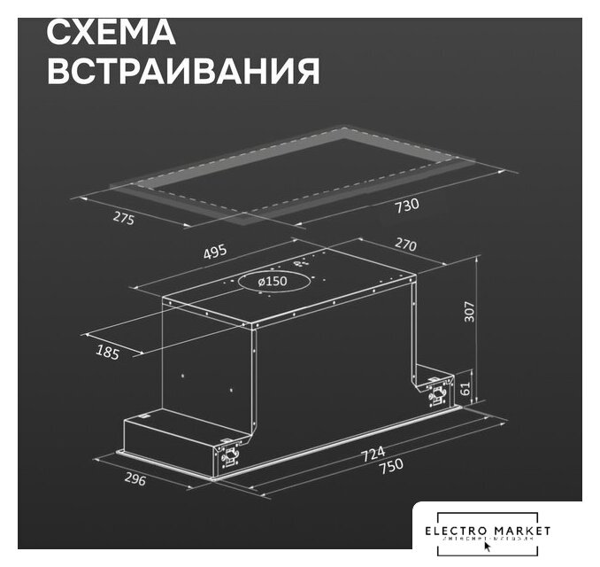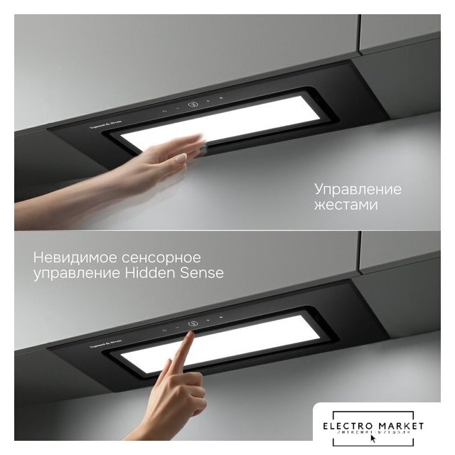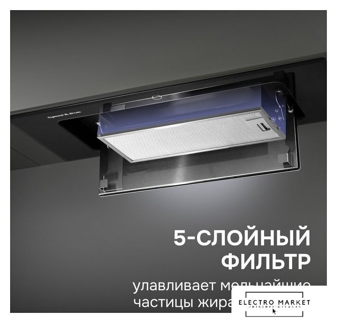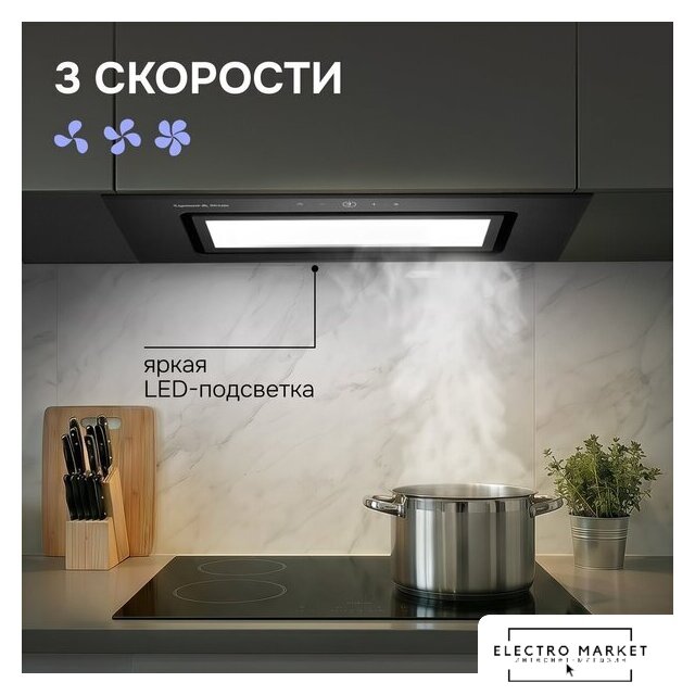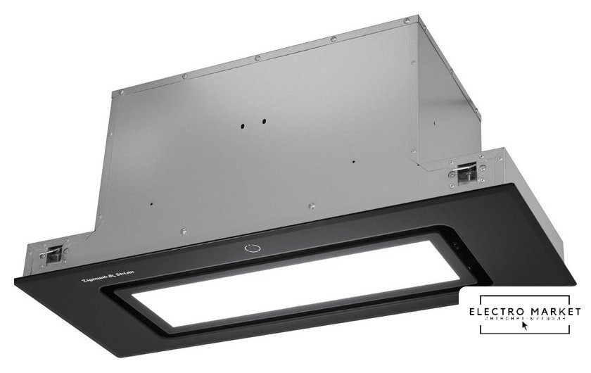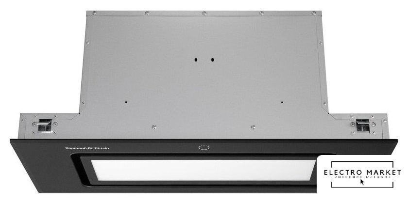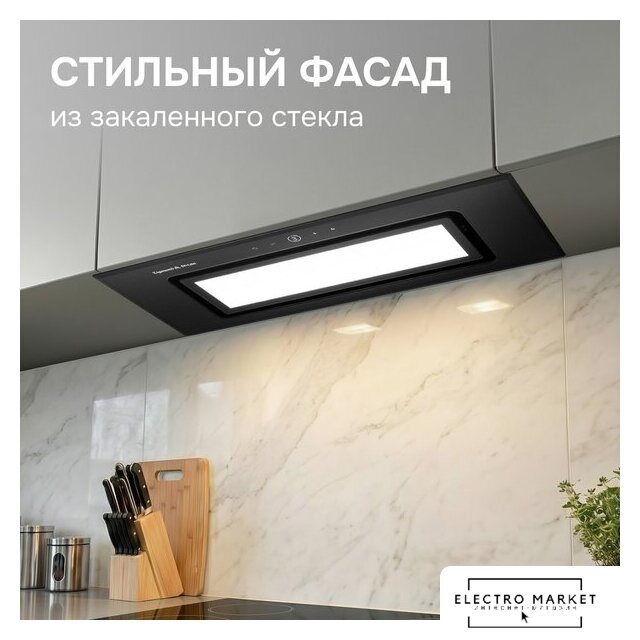 конструкция скрытая, монтаж для встраивания, ширина 52 см, управление электронное/кнопочное, производительность мотора 800 м³/ч, цвет черный