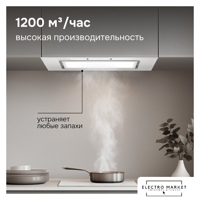 конструкция коробчатая, монтаж островной, ширина 35 см, управление электронное/кнопочное, производительность вытяжки 1000 м³/ч, производительность мотора 1300 м³/ч, цвет белый