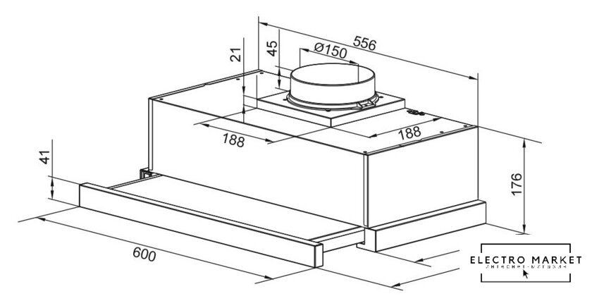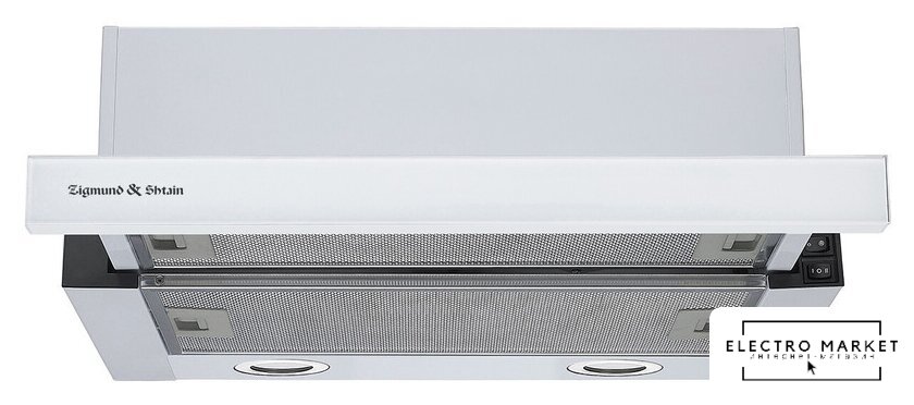 конструкция телескопическая, монтаж для встраивания, ширина 59.7 см, управление механическое/кнопочное, производительность вытяжки 450 м³/ч, производительность мотора 500 м³/ч, цвет нержавеющая сталь