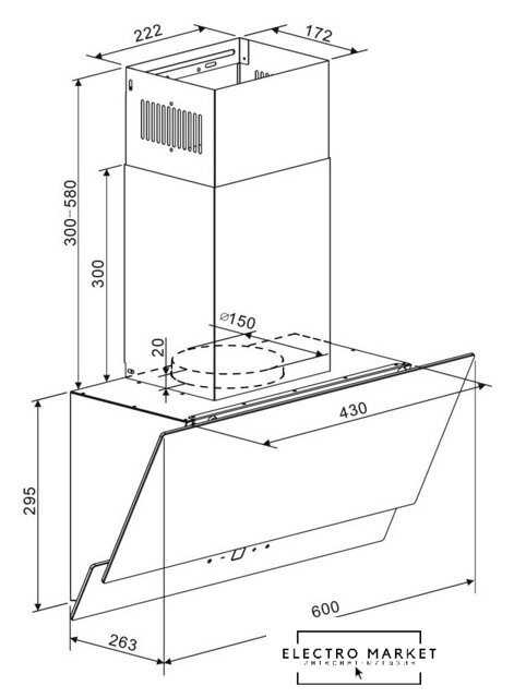конструкция наклонная, монтаж настенный, ширина 59.8 см, управление кнопочное, производительность вытяжки 169 м³/ч, цвет черный