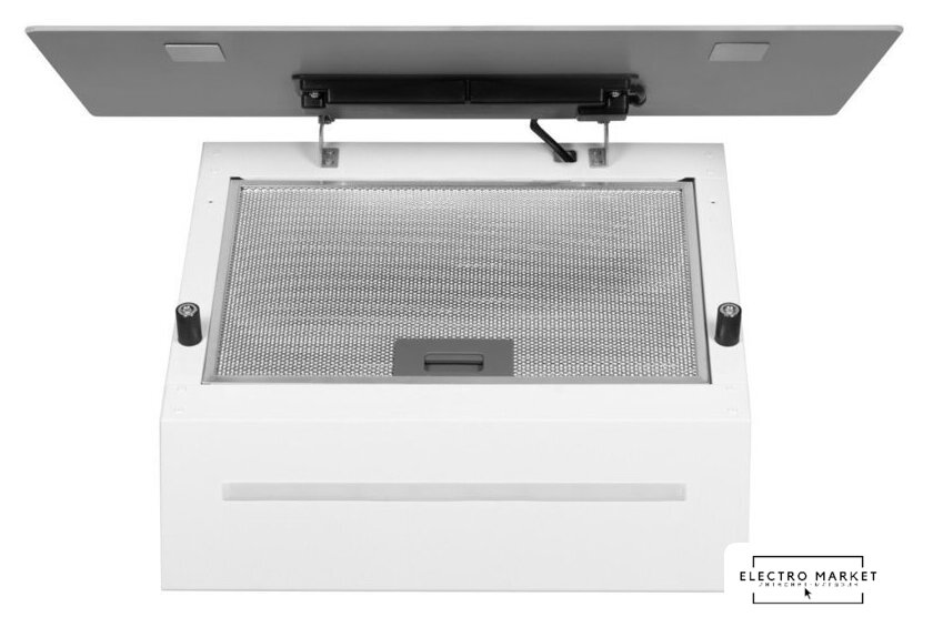 конструкция скрытая, монтаж для встраивания, ширина 52 см, управление электронное/кнопочное, производительность мотора 800 м³/ч, цвет белый