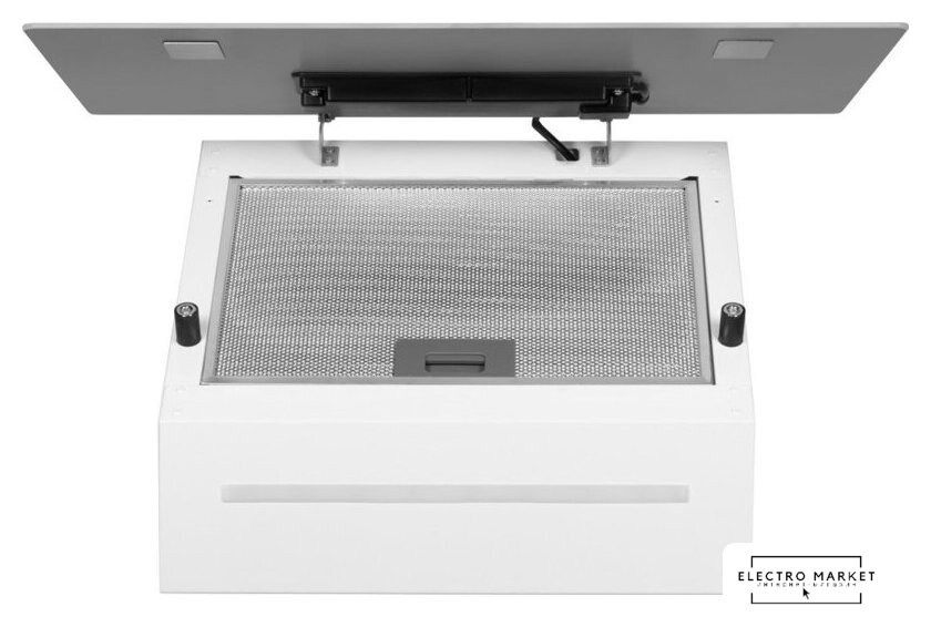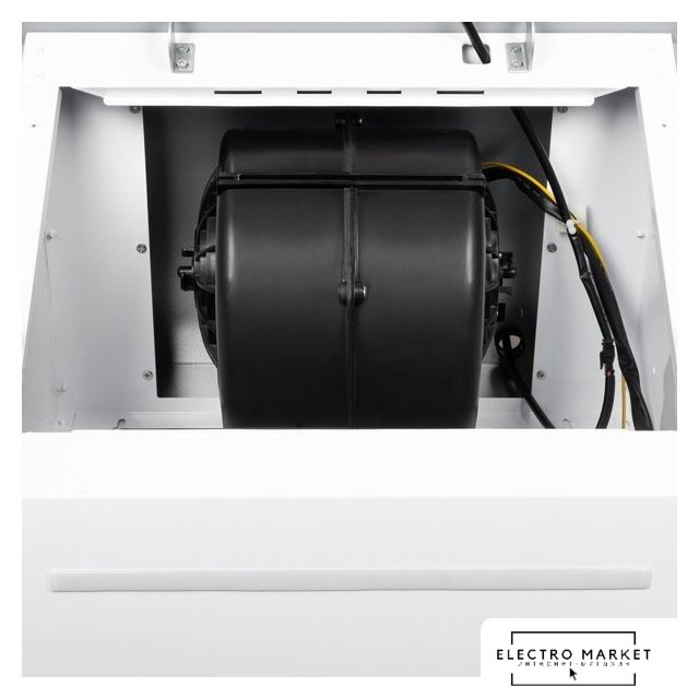 конструкция скрытая, монтаж для встраивания, ширина 52 см, управление электронное/кнопочное, производительность мотора 800 м³/ч, цвет белый