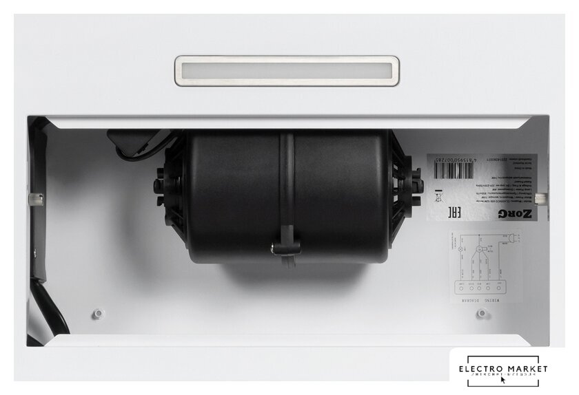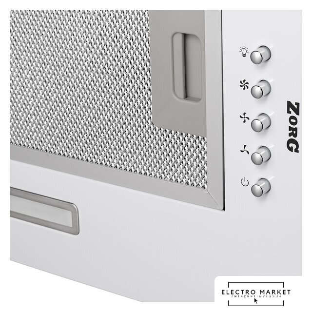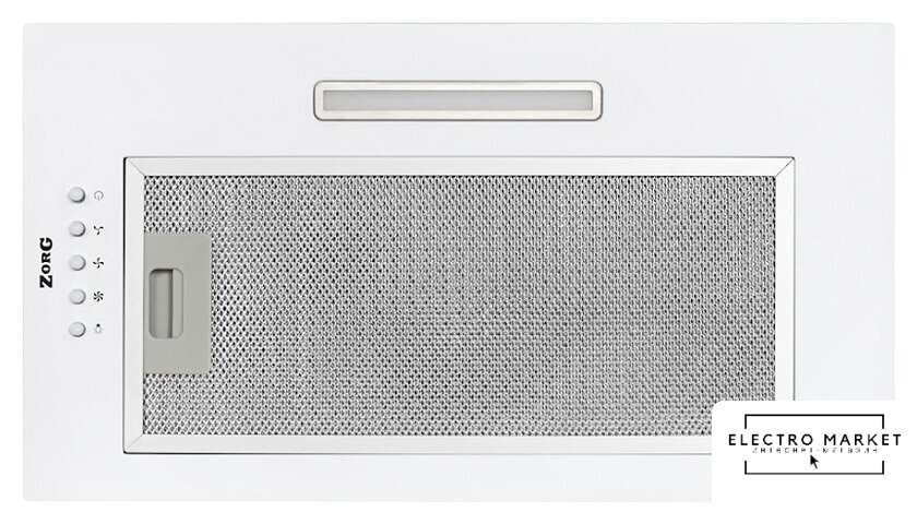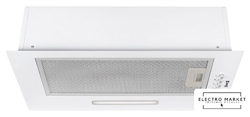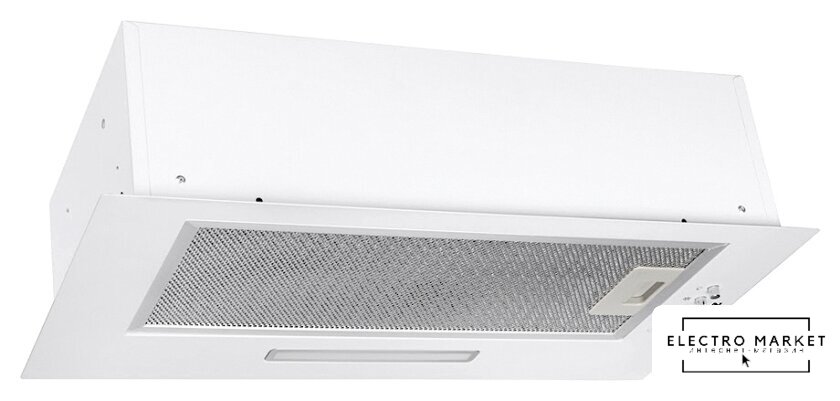 конструкция телескопическая, монтаж для встраивания, ширина 59.8 см, управление механическое/кнопочное, производительность мотора 650 м³/ч, цвет белый