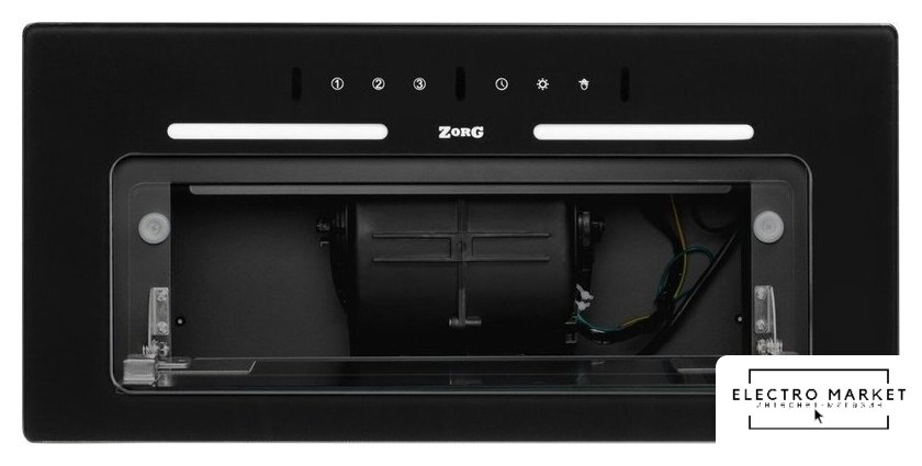 конструкция коробчатая, монтаж настенный, ширина 38 см, управление электронное/кнопочное, производительность мотора 1200 м³/ч, цвет черный