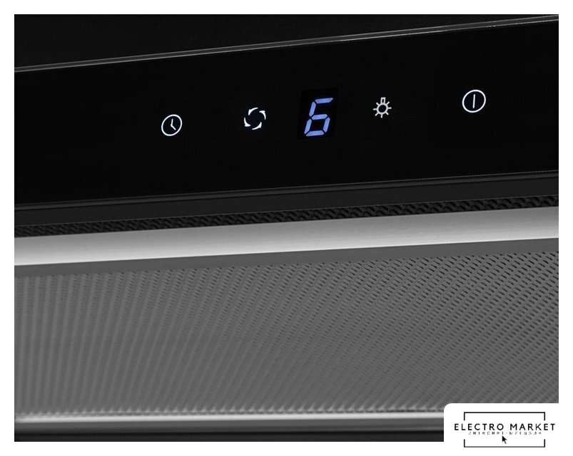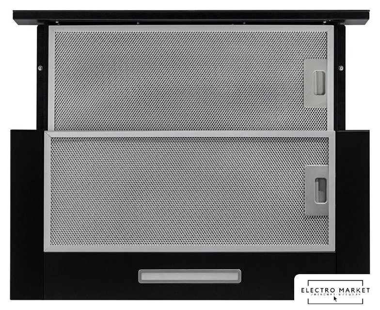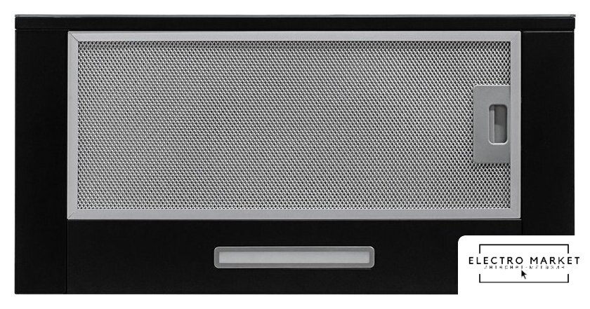 конструкция скрытая, монтаж для встраивания, ширина 49.8 см, управление механическое/кнопочное, производительность мотора 850 м³/ч, цвет черный