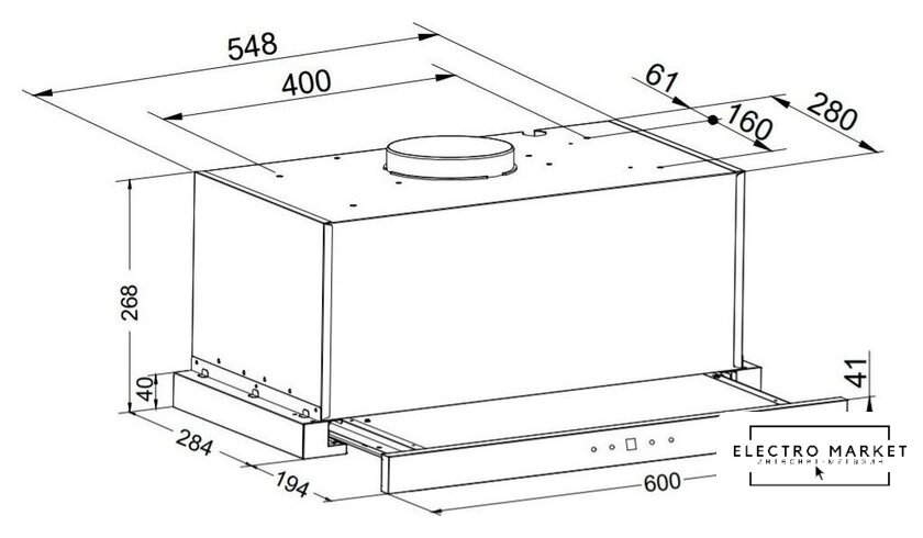 конструкция скрытая, монтаж для встраивания, ширина 56.4 см, управление слайдерное, производительность вытяжки 225 м³/ч, цвет серый
