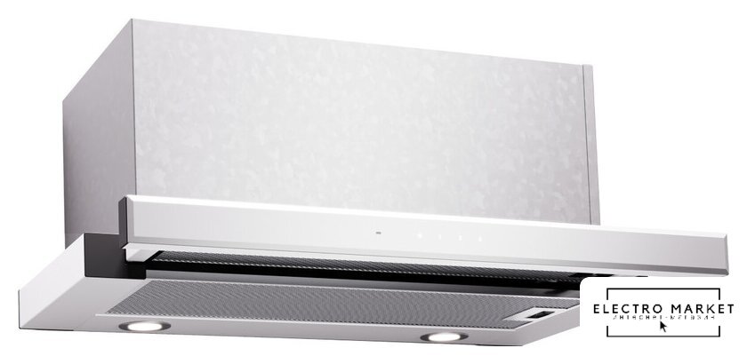 конструкция скрытая, монтаж для встраивания, ширина 51.4 см, управление электронное/кнопочное, производительность вытяжки 580 м³/ч, производительность мотора 1050 м³/ч, цвет серебристый/серый