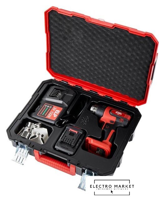 | Комплект поставки | - Пистолет горячего воздуха- Аккумулятор 4 Ач- Зарядное устройство- Насадки, 4 шт.- Кейс- Паспорт |