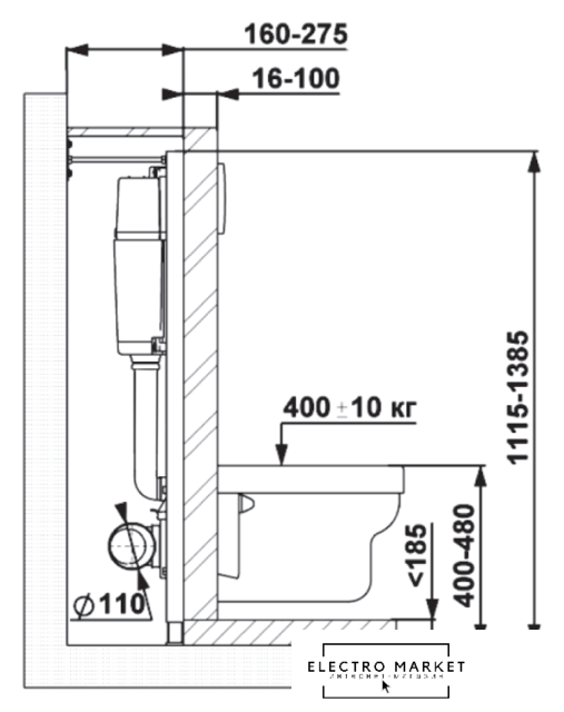 крепление на капитальную стену/на пол/на некапитальную стену, макс. нагрузка 400 кг, двухрежимный слив, механическое управление, 50x109-129x14-23.5 см