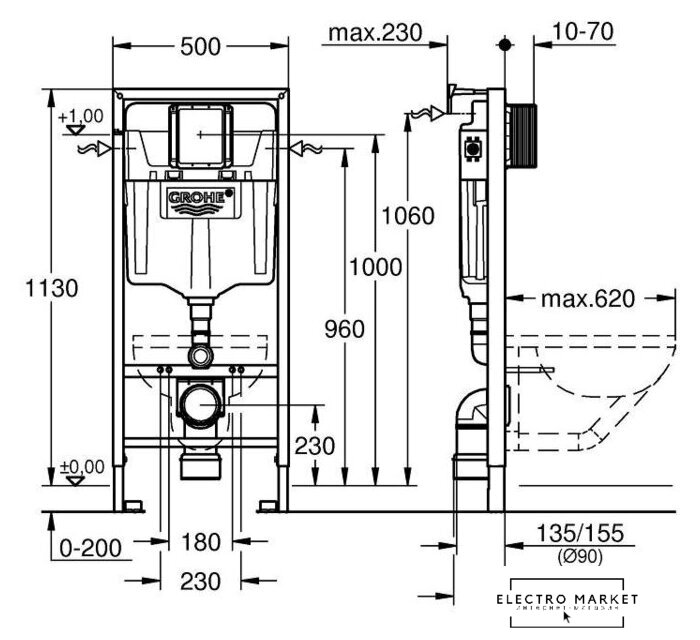 | Отверстия под унитаз | 180 мм, 230 мм |
