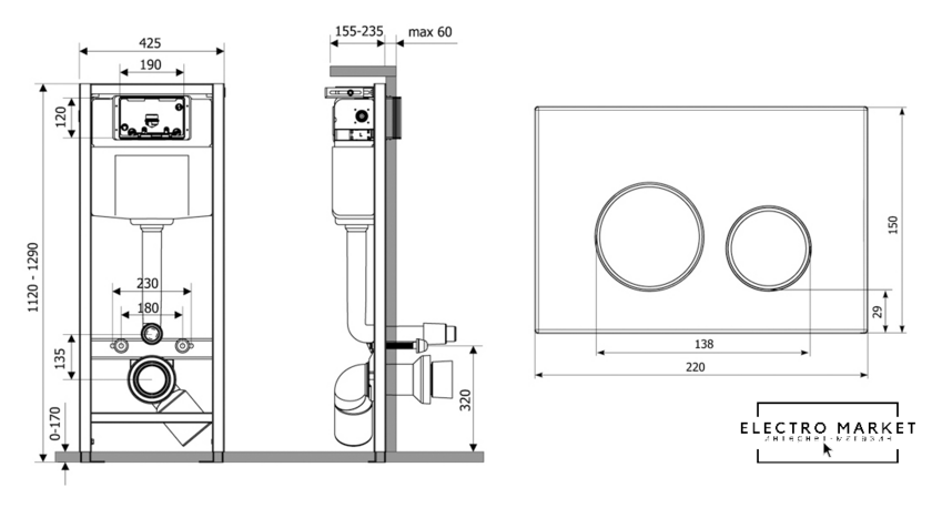 крепление на капитальную стену/на пол/на некапитальную стену, макс. нагрузка 400 кг, двухрежимный слив, механическое управление, бачок в комплекте, 42.5x129x23.5 см