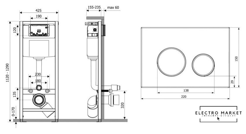 крепление на капитальную стену/на пол/на некапитальную стену, макс. нагрузка 400 кг, двухрежимный слив, механическое управление, бачок в комплекте, 42.5x129x45 см
