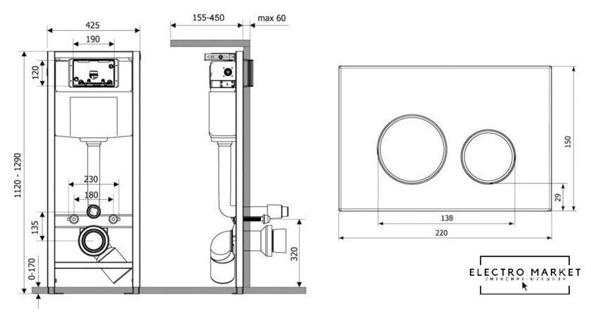 крепление на капитальную стену/на пол/на некапитальную стену, макс. нагрузка 400 кг, двухрежимный слив, механическое управление, бачок в комплекте, 42.5x129x23.5 см