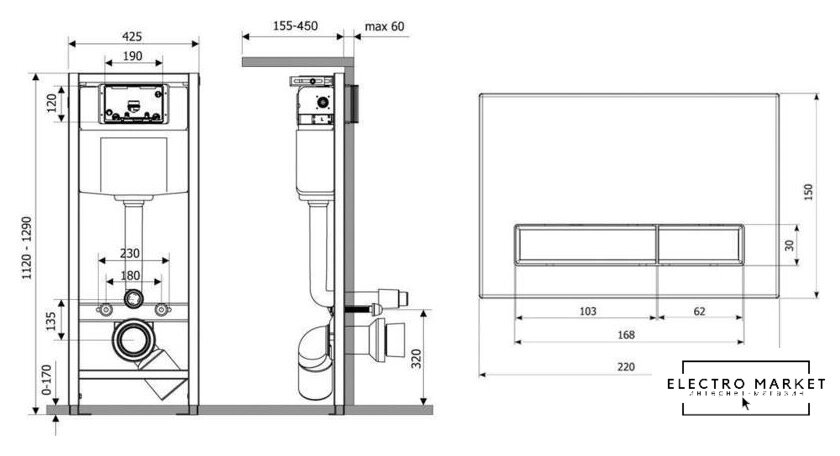 крепление на капитальную стену/на пол/на некапитальную стену, макс. нагрузка 400 кг, двухрежимный слив, механическое управление, бачок в комплекте, 42.5x129x45 см