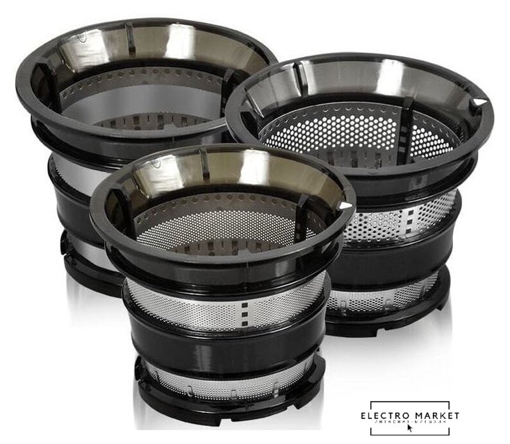 | Комплектация | - 3 сита для соков, пюре и сорбетов;- насадка ломтерезка;- насадка терка;- щетка для очистки. |