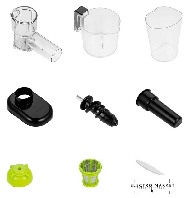 Комплектация | Соковыжималка:моторный отсек - 1 штотжимной блок - 1 штшнек - 1 штфильтр - 1 штзажим - 1 штЛоток - 1 штТолкатель - 1 штКонтейнер для сока - 1 штКонтейнер для жмыха - 1 штЩётка для чистки - 1 штРуководство по эксплуатации - 1 штГарантийный талон - 1 шт |