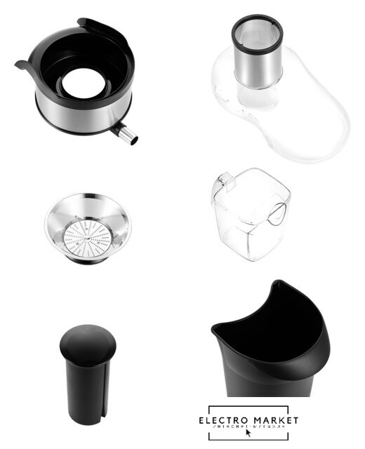 | Комплектация | Соковыжималка:моторный отсек - 1 штчаша - 1 штфильтр - 1 штверхняя крышка - 1 штТолкатель - 1 штКонтейнер для жмыха - 1 штКонтейнер для сока с декантером - 1 штРуководство по эксплуатации - 1 штГарантийный талон - 1 шт |