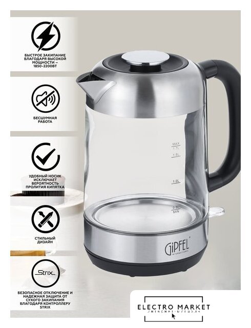 2200 Вт, объем 1.7 л, терморегулятор, цвет нержавеющая сталь/черный