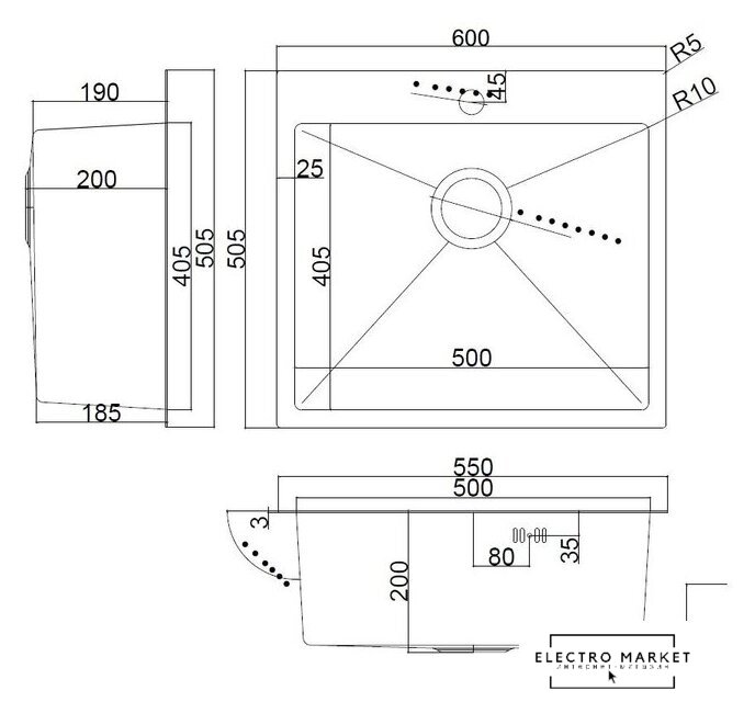 врезная на столешницу, нержавеющая сталь, фактура: сатин, размеры: 55x50 см, глубина чаши: 22 см