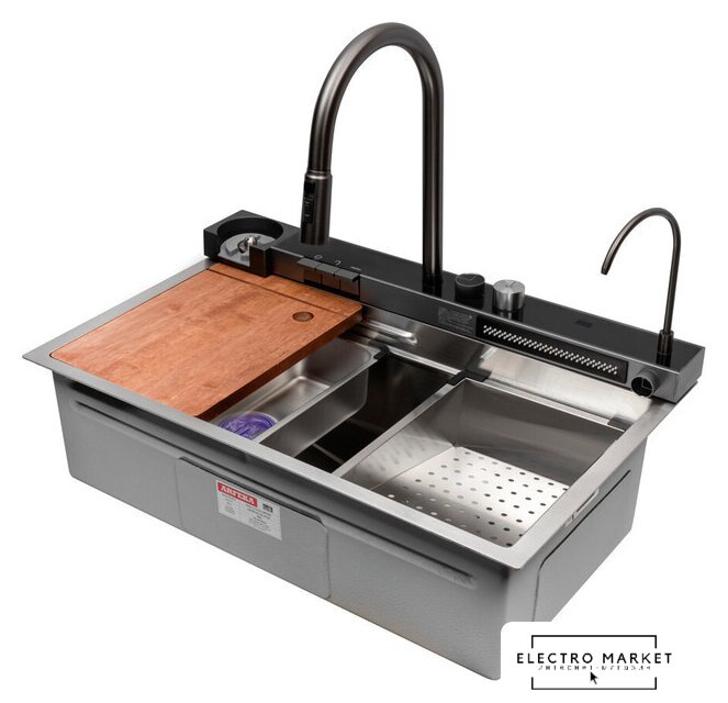 | Комплектация | смеситель, кран под фильтрованную воду, автоматический омыватель стакана (встроенный), коландер 2 шт, разделочная доска, сливная арматура, гарантийный талон, коробка |