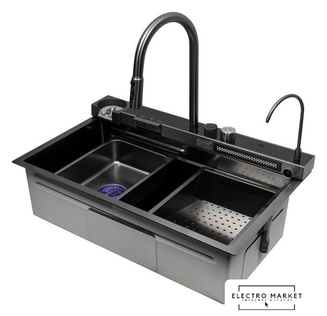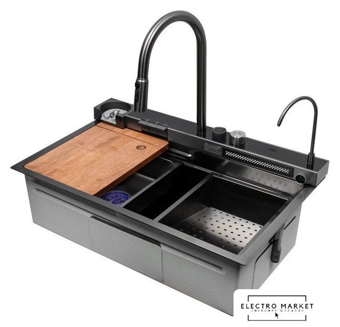 | Комплектация | смеситель, кран под фильтрованную воду, автоматический омыватель стакана (встроенный), коландер 2 шт, разделочная доска, сливная арматура, гарантийный талон, коробка |