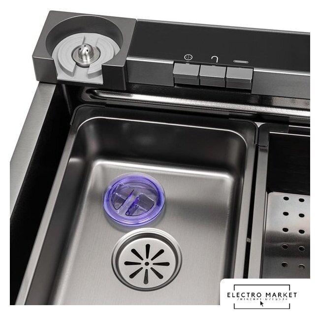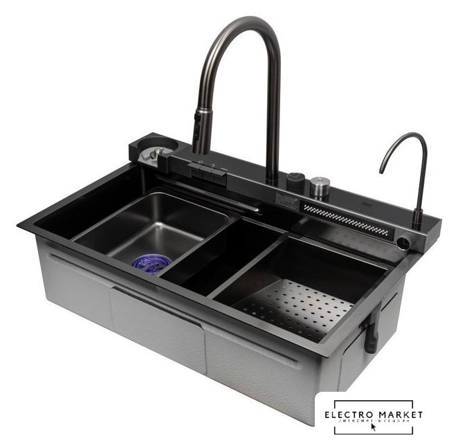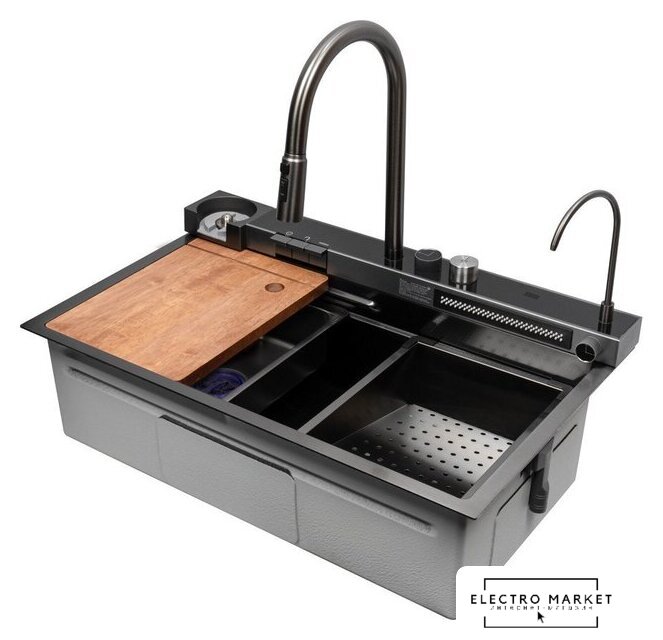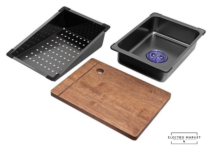 | Комплектация | смеситель, кран под фильтрованную воду, автоматический омыватель стакана (встроенный), коландер 2 шт, разделочная доска, сливная арматура, гарантийный талон, коробка |