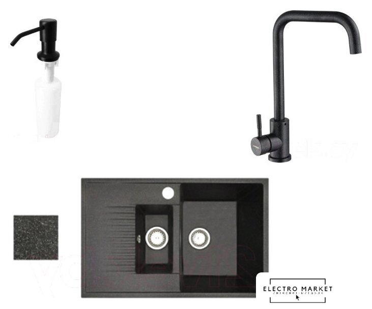 Комплектация | смеситель, кухонная мойка, дозатор для жидкого мыла |
