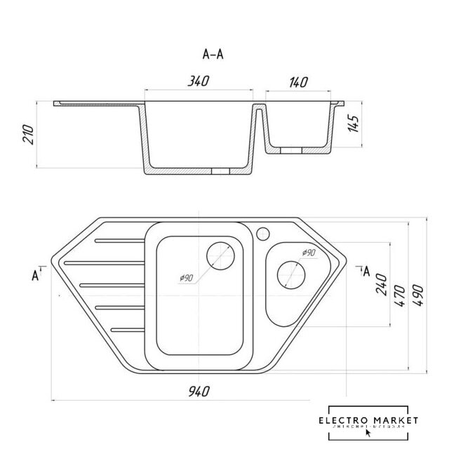 врезная на столешницу, искусственный камень, размеры: 95x50 см