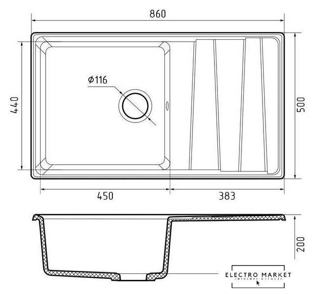 врезная на столешницу, искусственный камень, размеры: 86x50 см, в шкаф 60 см
