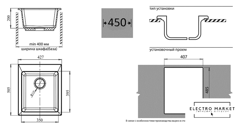врезная на столешницу, искусственный камень, размеры: 42.7x50.5 см, в шкаф 45 см