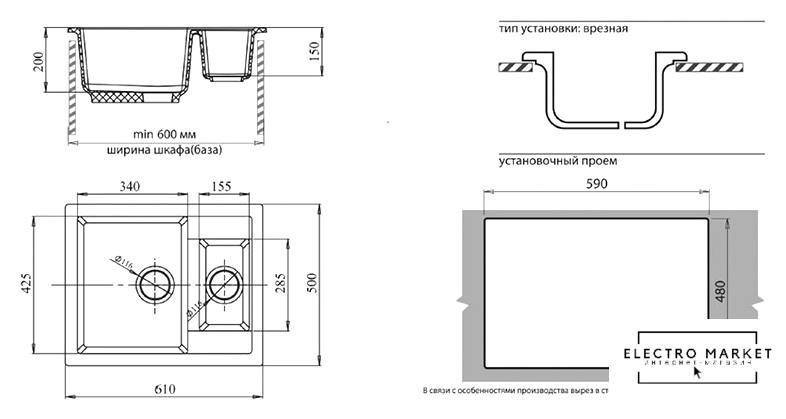врезная на столешницу, искусственный камень, размеры: 61x50 см, в шкаф 60 см